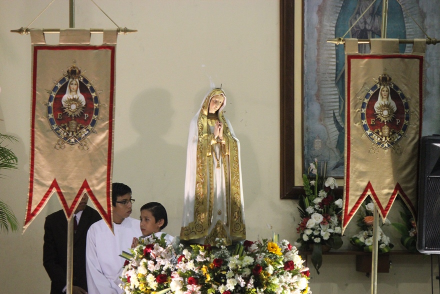 El padre, Fray Francisco Meza, párroco de la Iglesia de Nuestra Señora de Fátima en Guayaquil, invitó a los Heraldos del Evangelio a colaborar con la animación litúrgica en la Santa Misa en honra a la Santísima Virgen de Fátima por el aniversario de los 100 años de sus apariciones.
