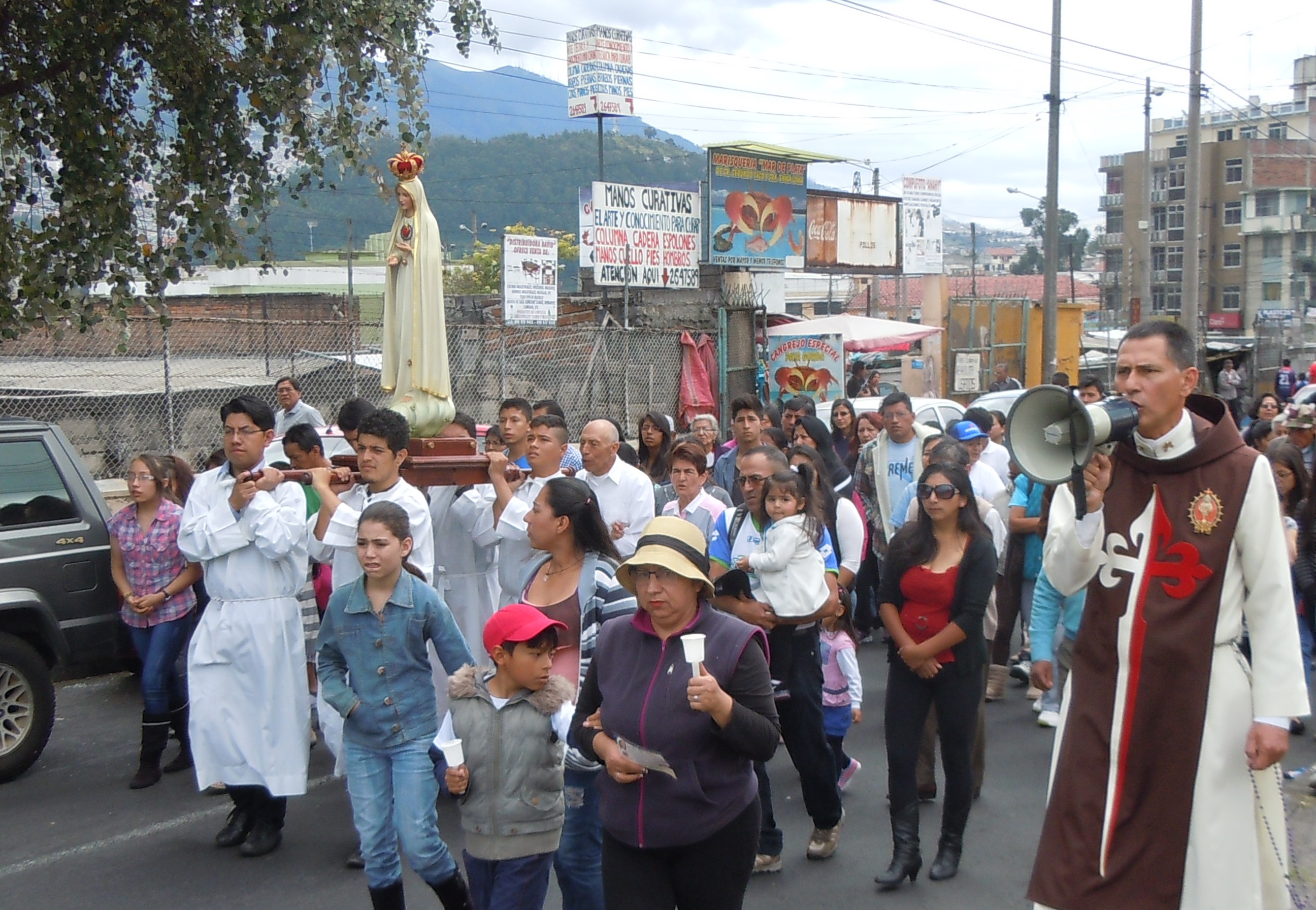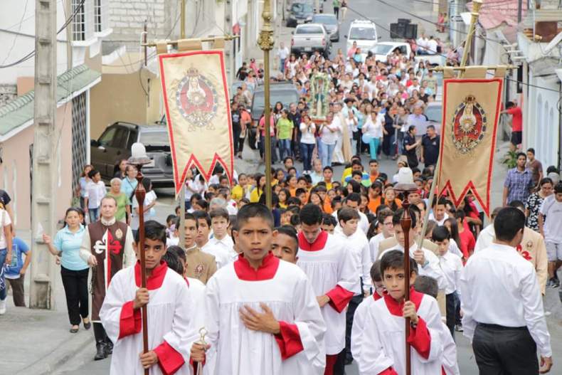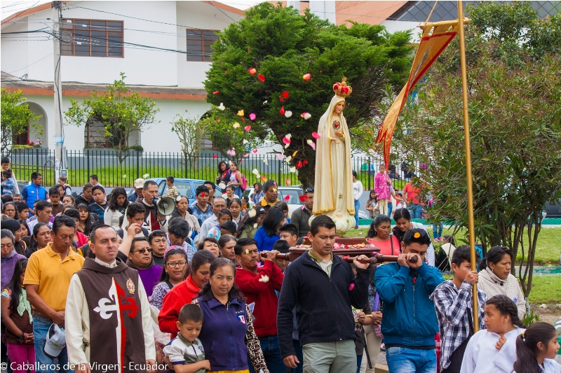 La imagen peregrina del Inmaculado Corazón de María visitó la parroquia de la Sagrada Familia en el sector del Condado en Quito. Los Heraldos del Evangelio colaboraron con la animación liturgica y el rezo del rosario durante la procesión.
